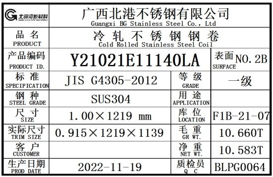 一、同意广西北港不锈钢有限公司生产的“北部湾新材料”牌不锈钢冷轧卷板SUS304牌号产品在我所注册。